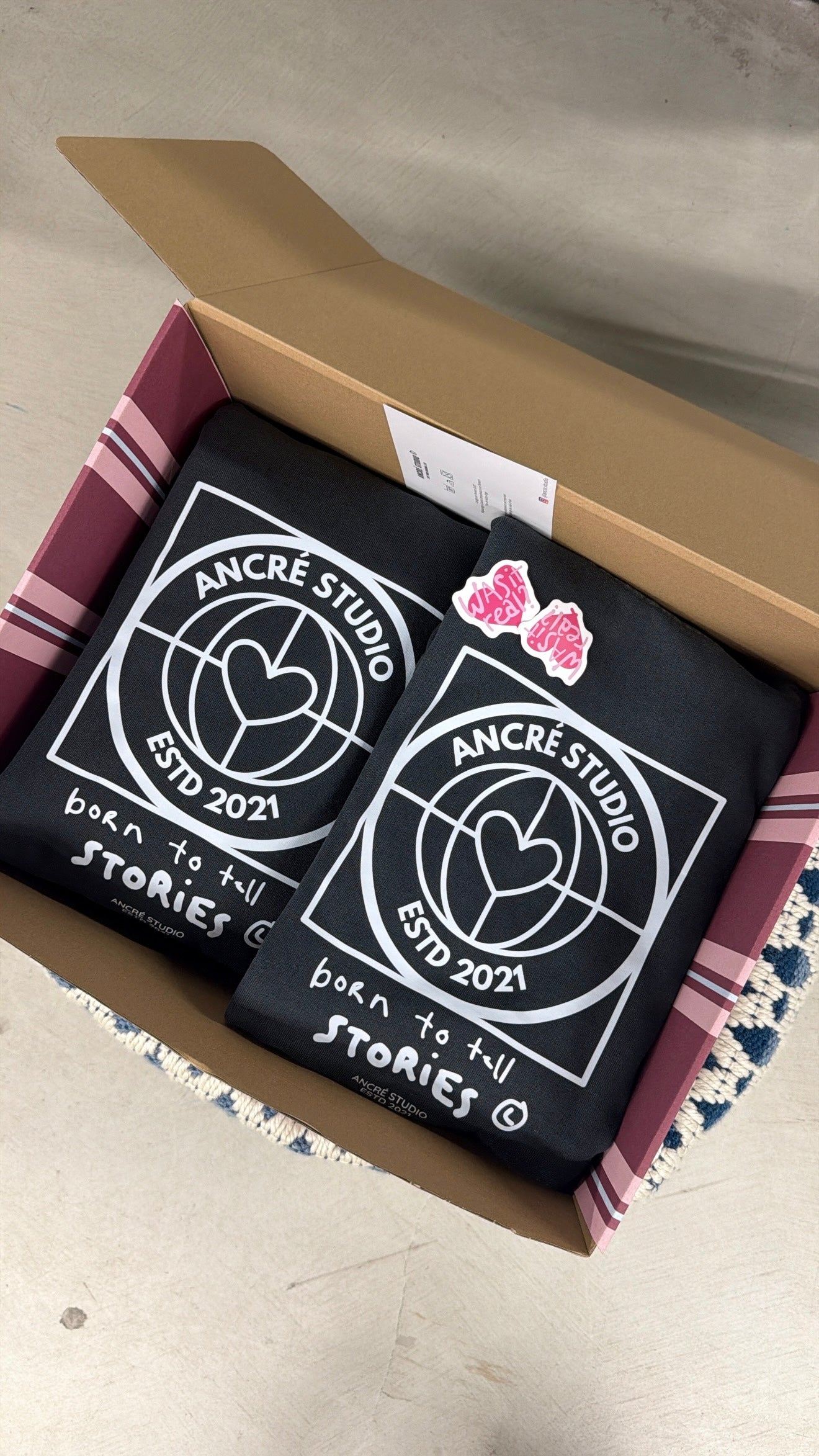 - 2 sweats "stories" noir délavé pour matcher avec la personne de ton choix.
